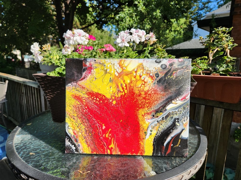 Crafted with masterful fluid techniques, this luxurious artwork blends bold reds, radiant yellows, and deep blacks into a mesmerizing dance of color and texture.
