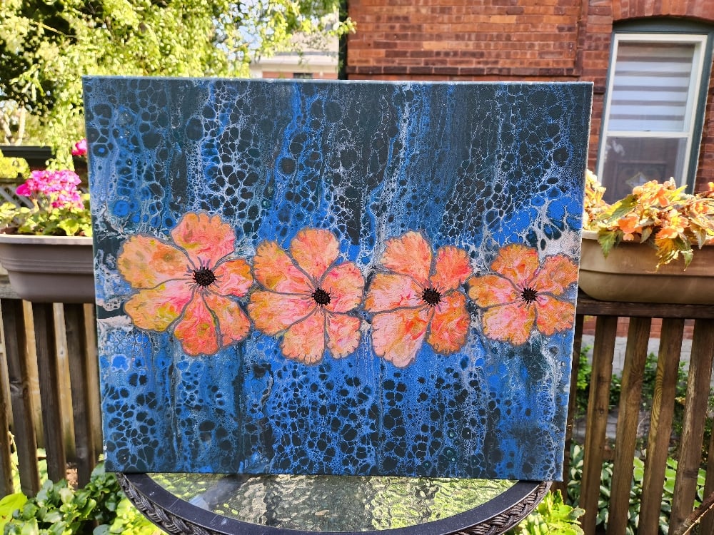 Elevate your living space with "Riverside Blooms," a captivating 20x24" original acrylic on canvas masterpiece that blends the serenity of nature with abstract elegance. This one-of-a-kind artwork features a mesmerizing deep blue background, alive with intricate cellular patterns in shades of indigo, navy, and midnight black—evoking the fluid motion of a tranquil river under twilight skies. At its heart, a row of five vibrant blooms bursts forth in luxurious hues of coral orange, soft pink, and warm yellow, each petal delicately textured and centered with a striking black core, symbolizing renewal and quiet strength.